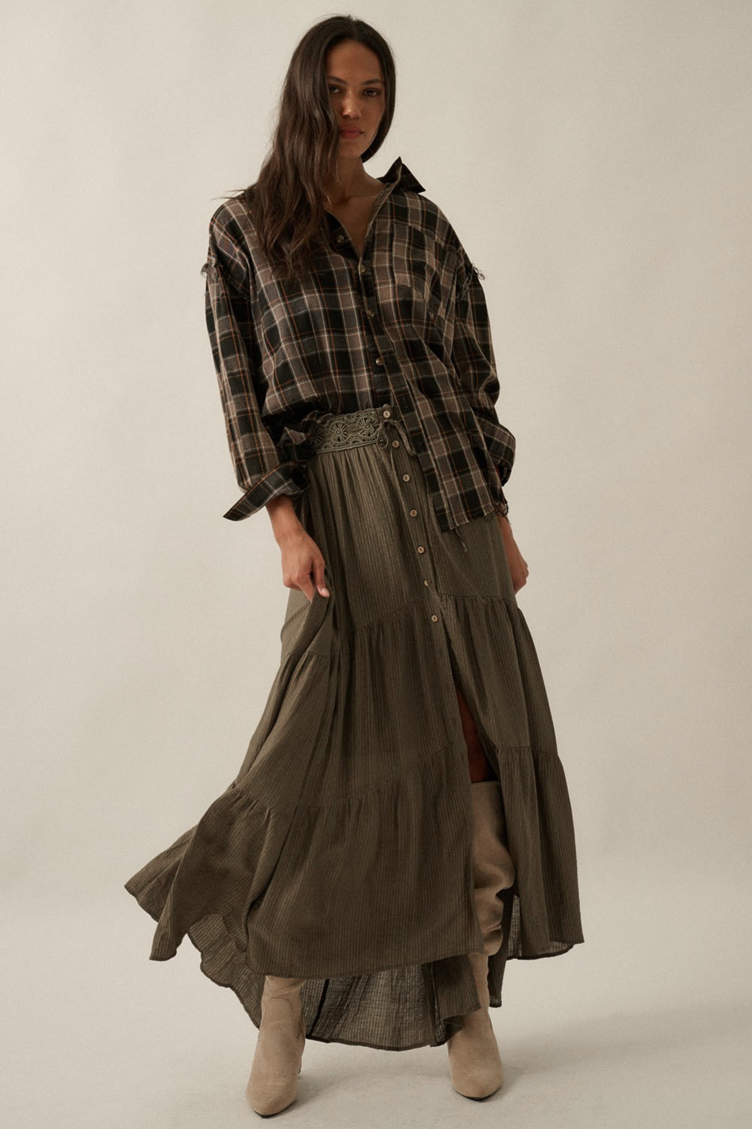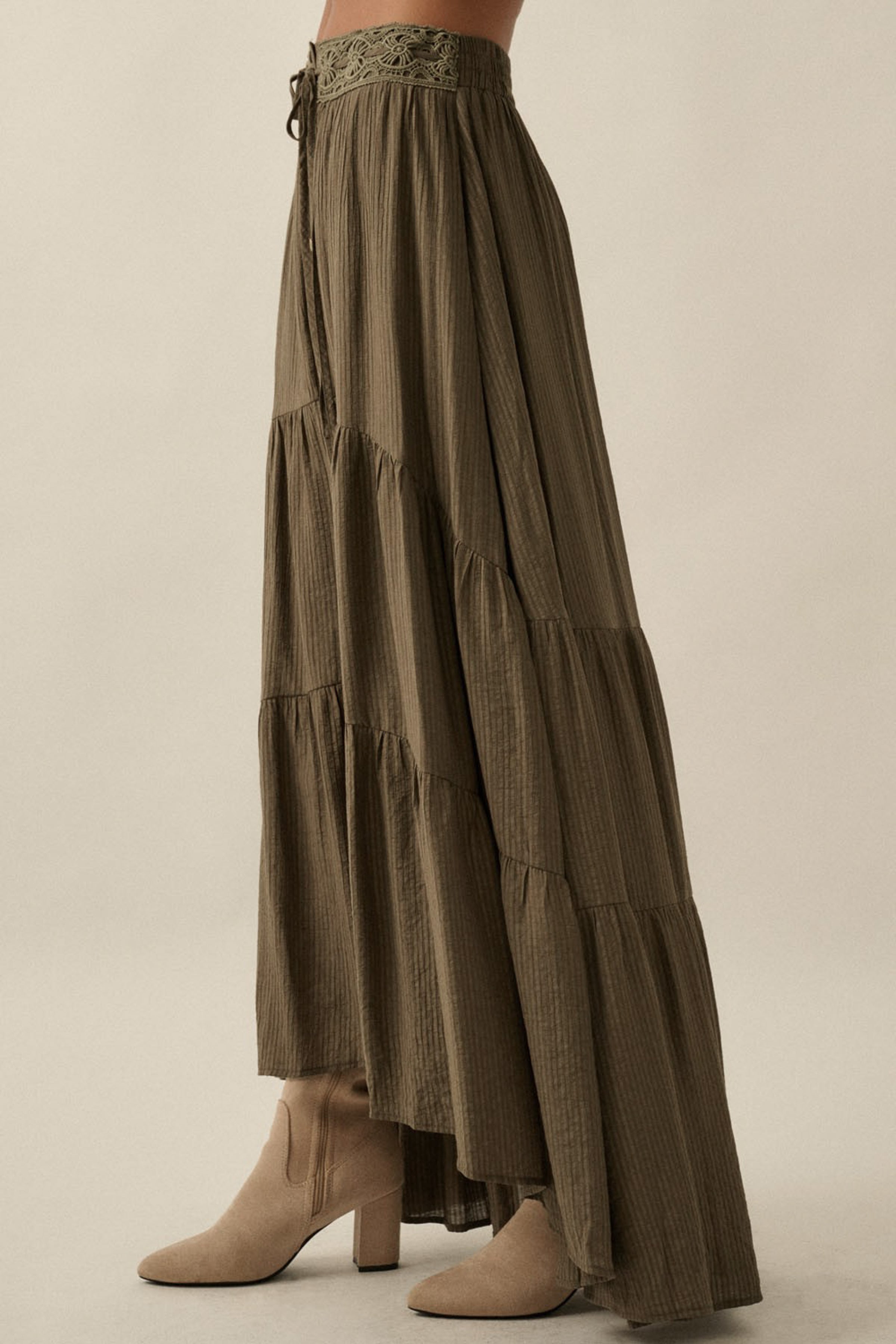 Olive woven maxi skirt with a lace-trimmed waistband.