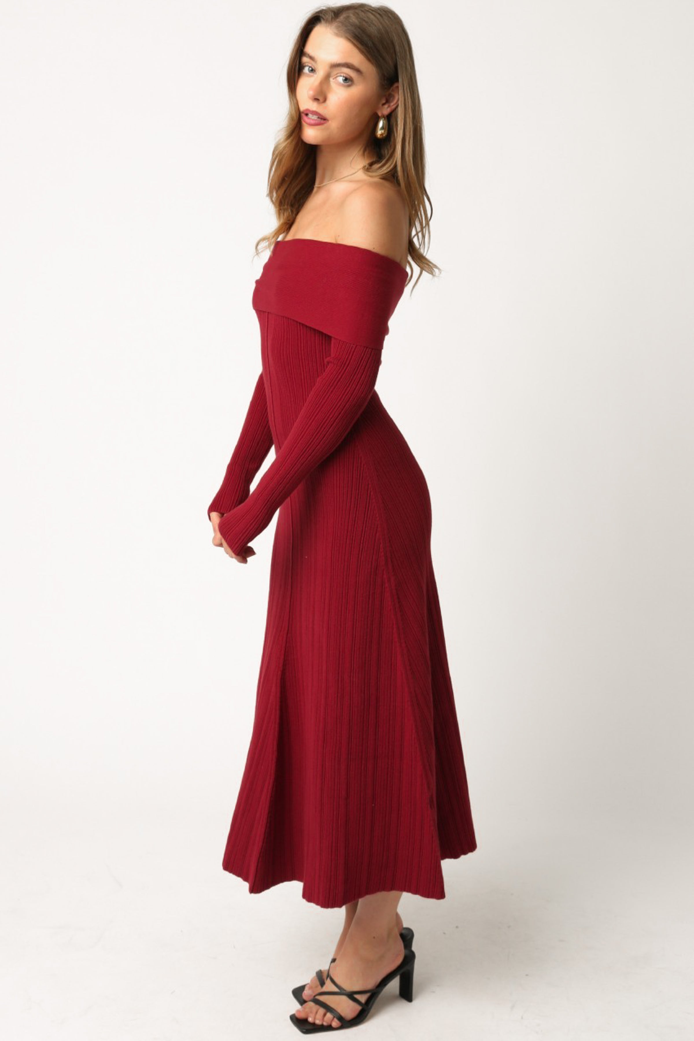 Burgundy off the shoulder knit midi dress.