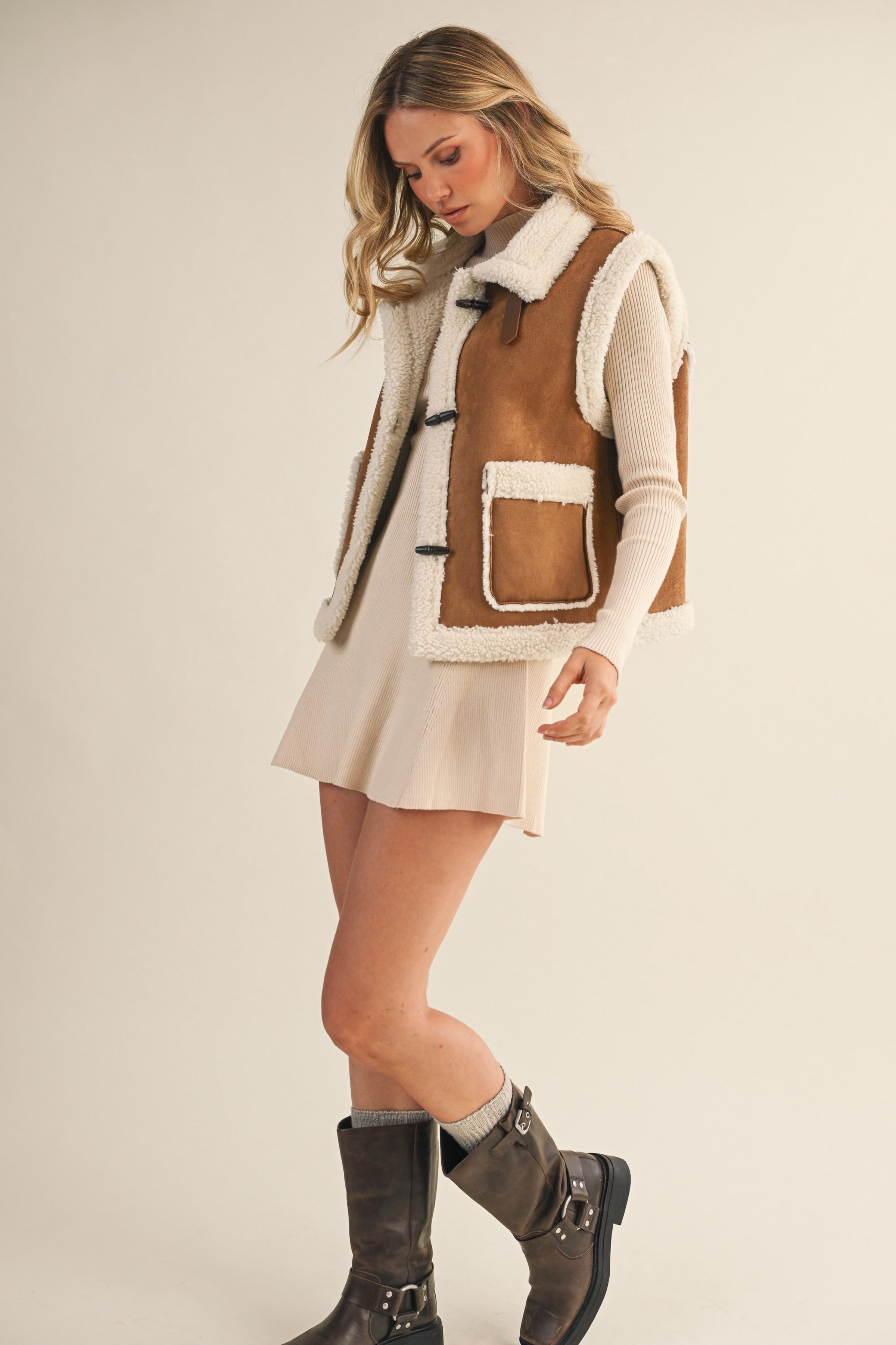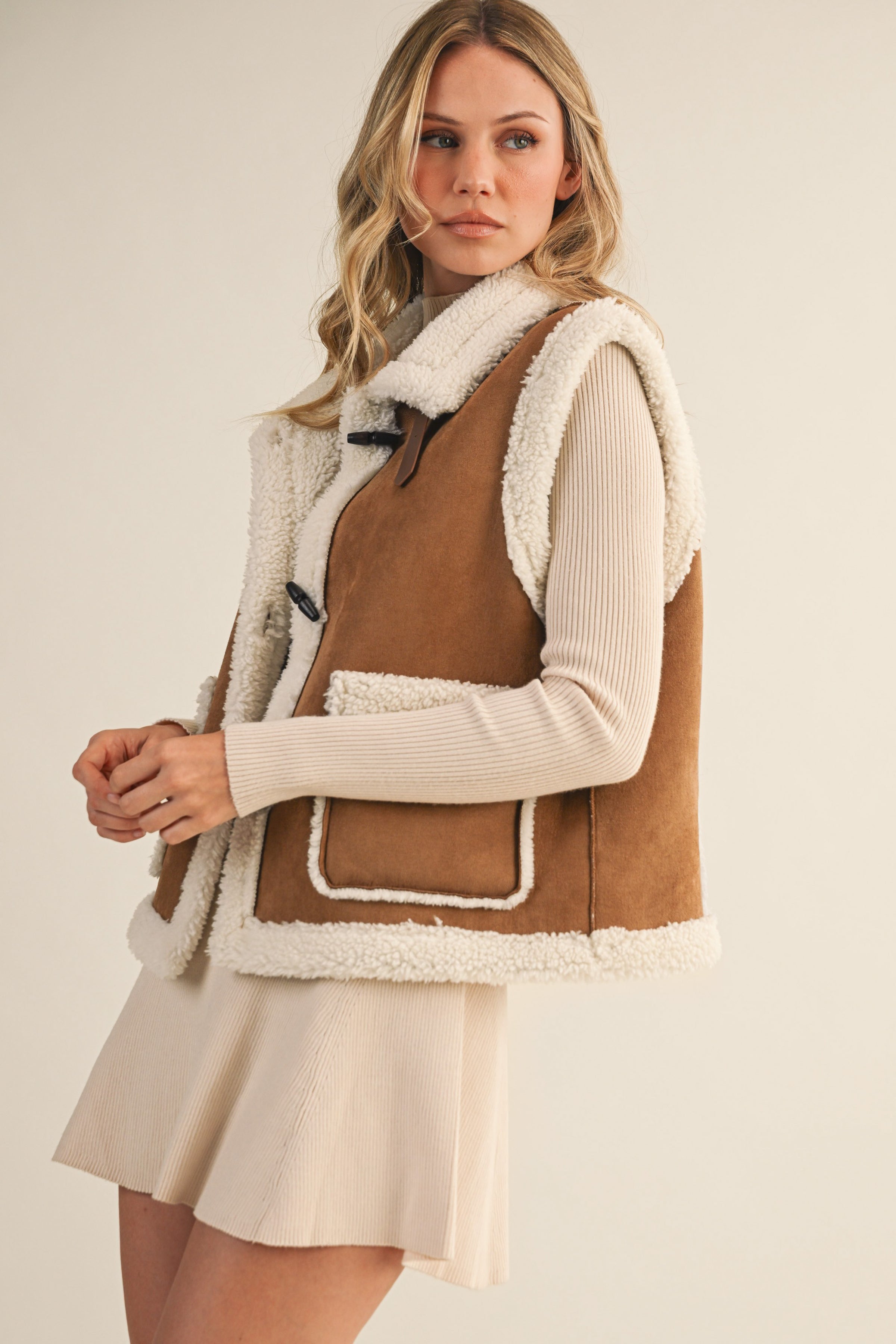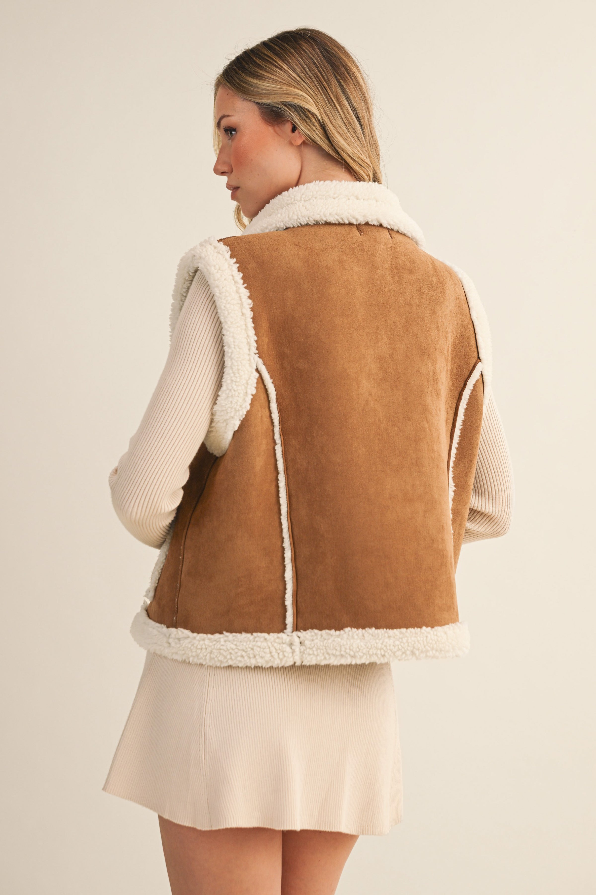 Neutral suede and sherpa vest.