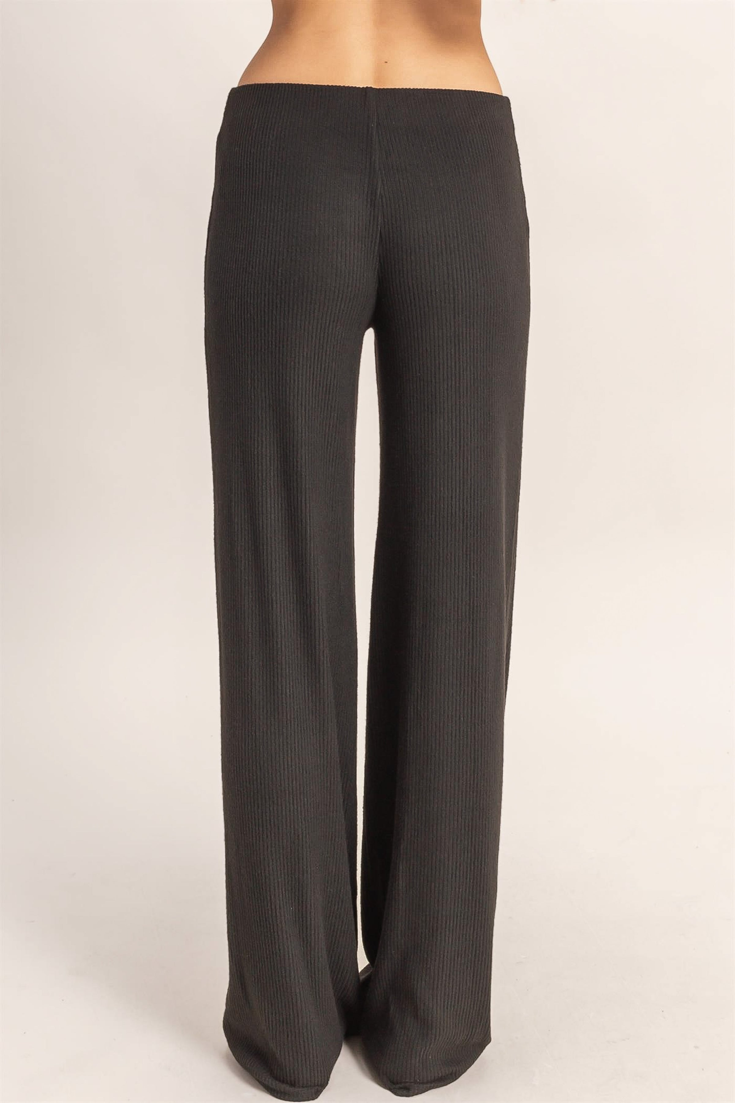 Black ribbed mid-rise pant.