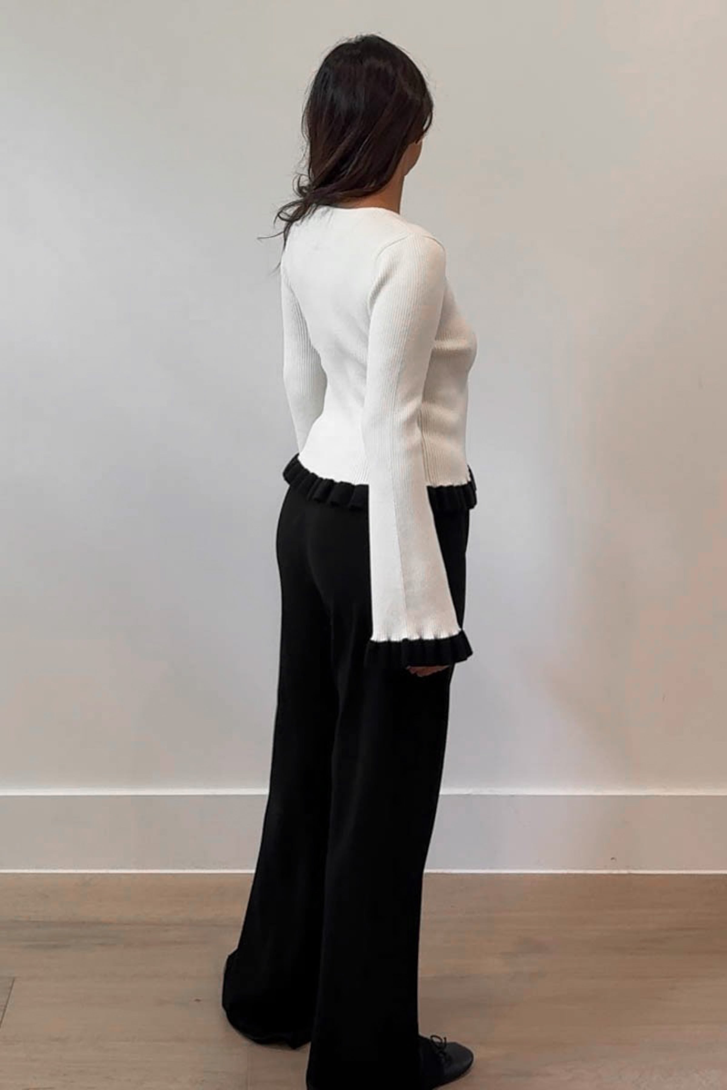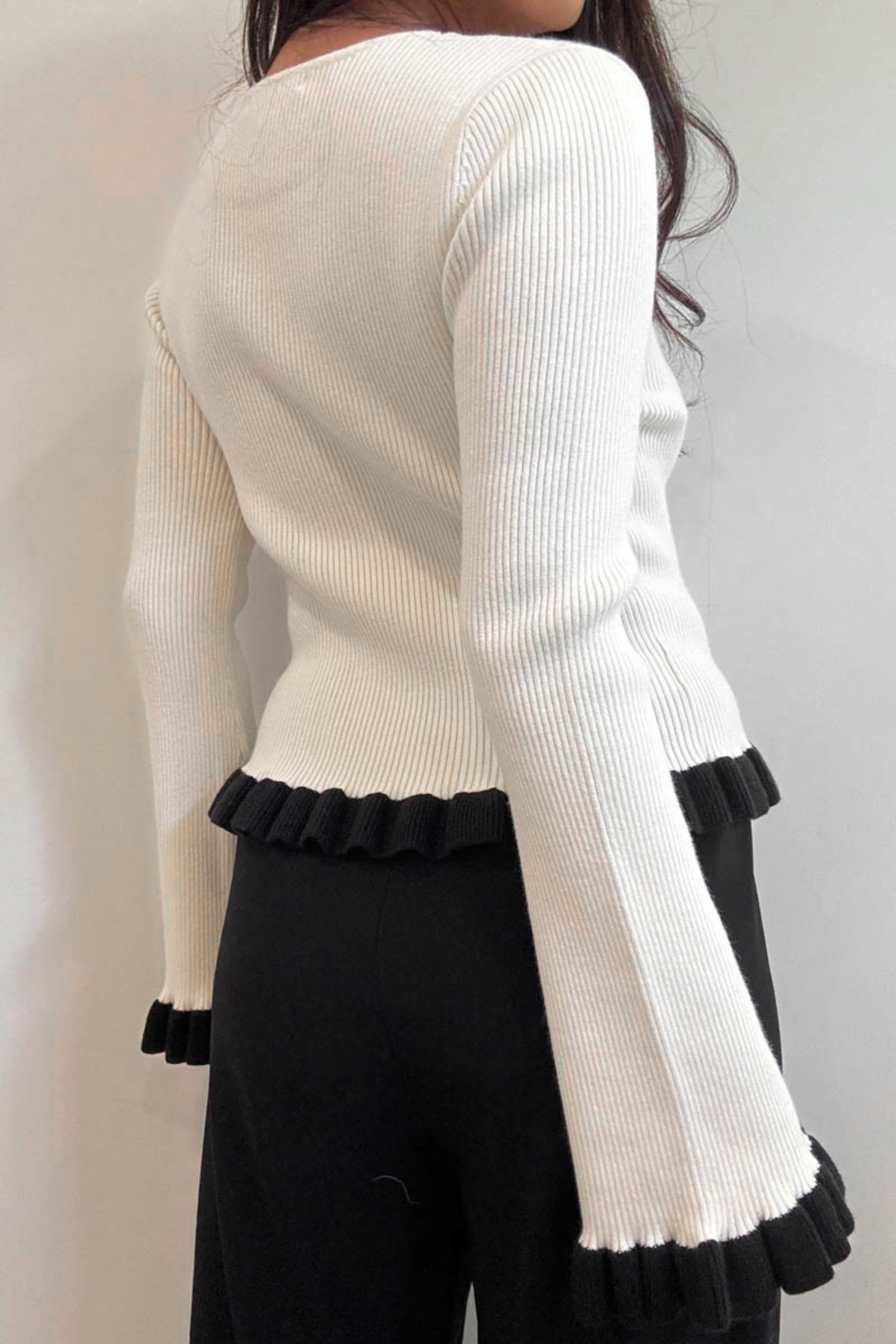 Chic knit cardigan featuring a unique contrast frill hem at both the bottom hem and sleeve openings.