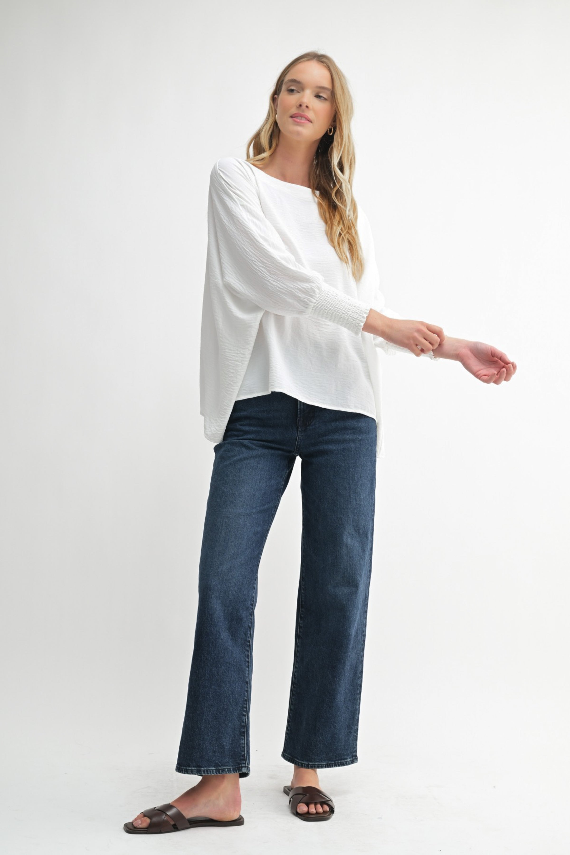 Dolman sleeve with smocked cuff.