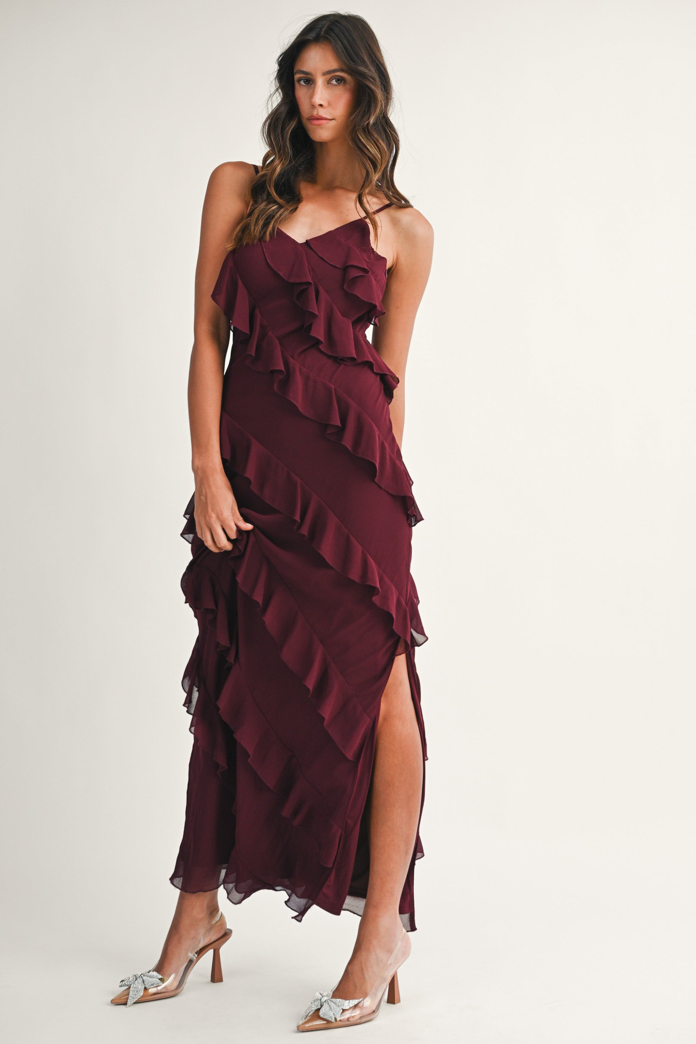 Burgundy maxi dress with asymmetrical ruffles throughout.