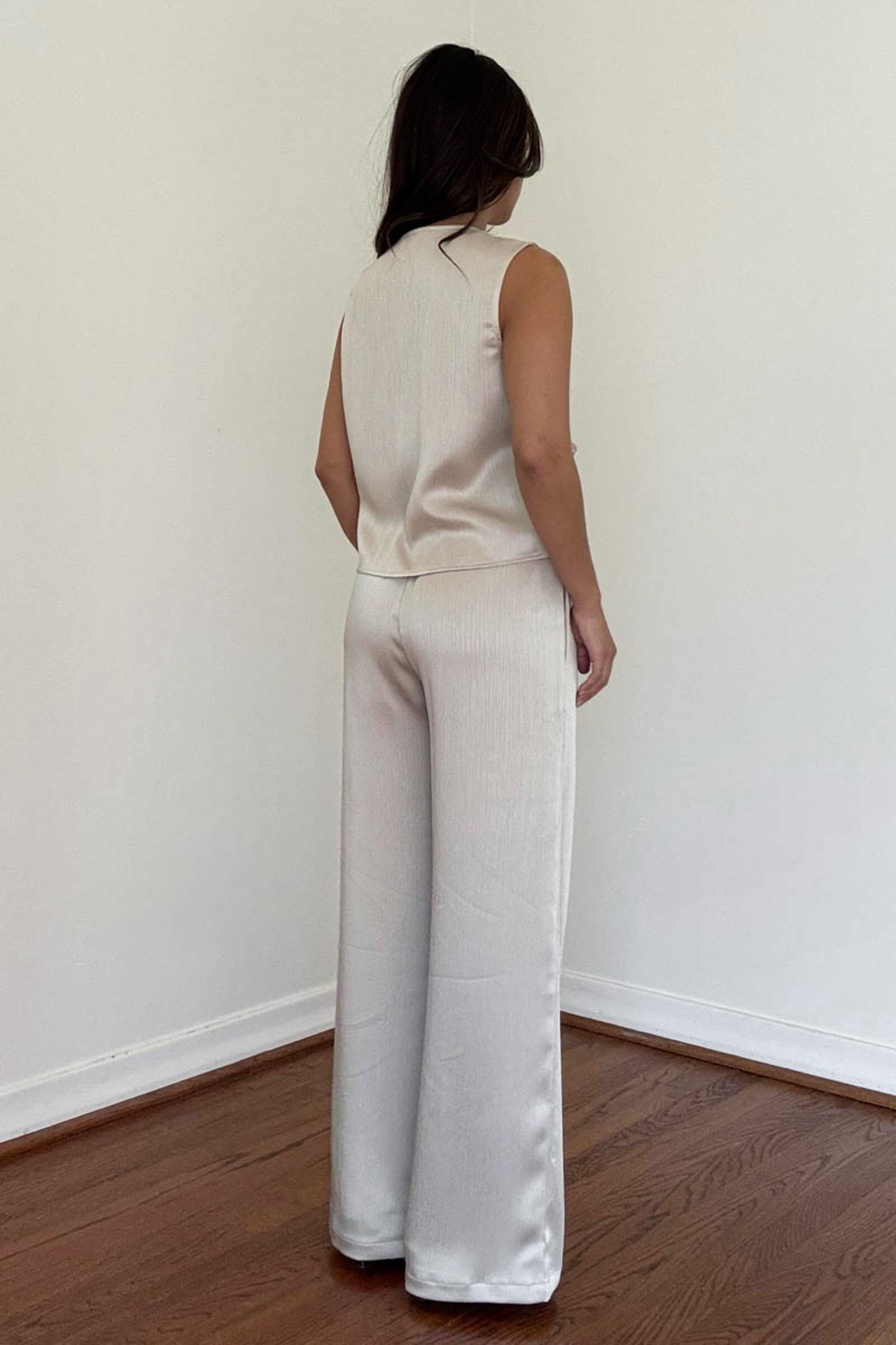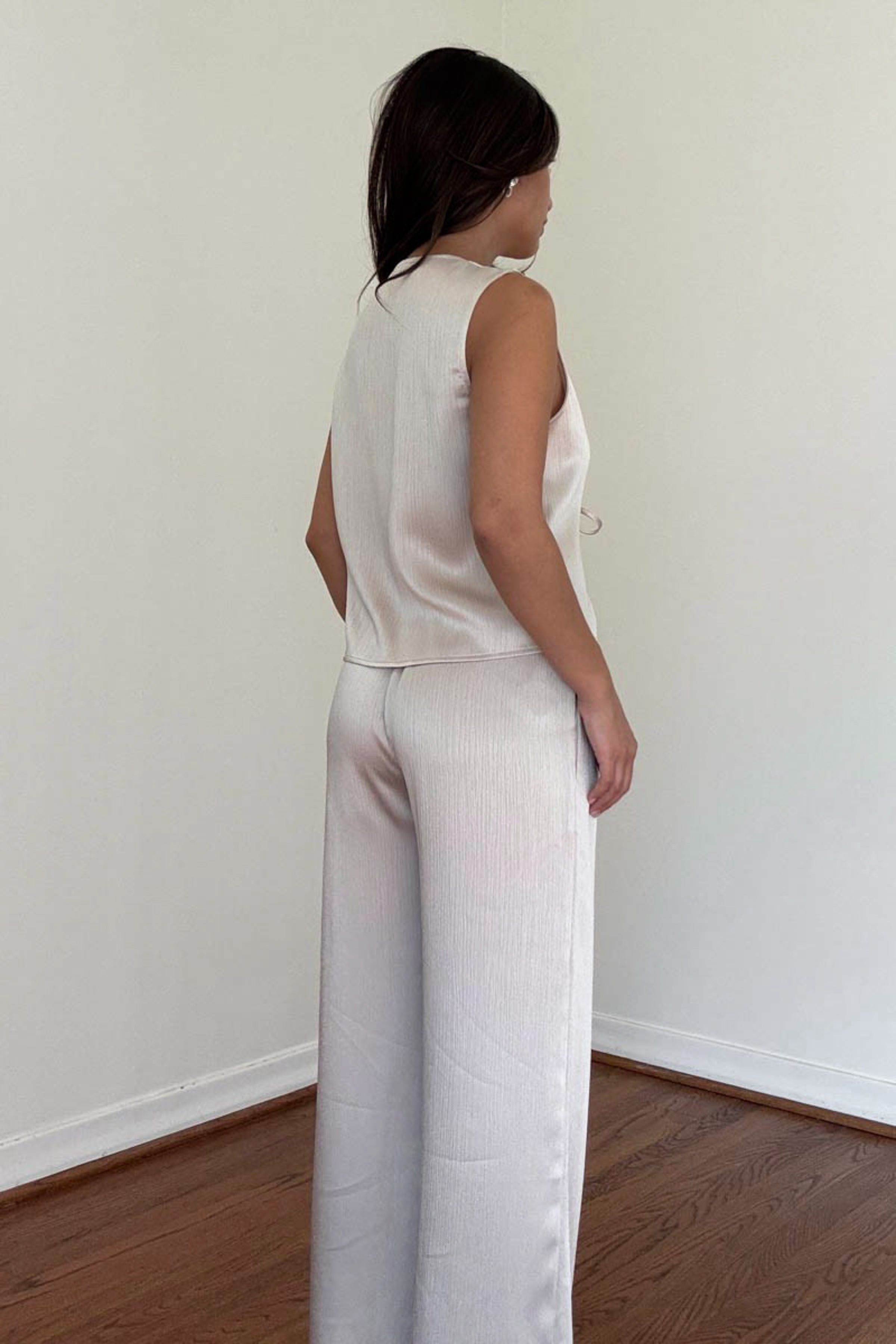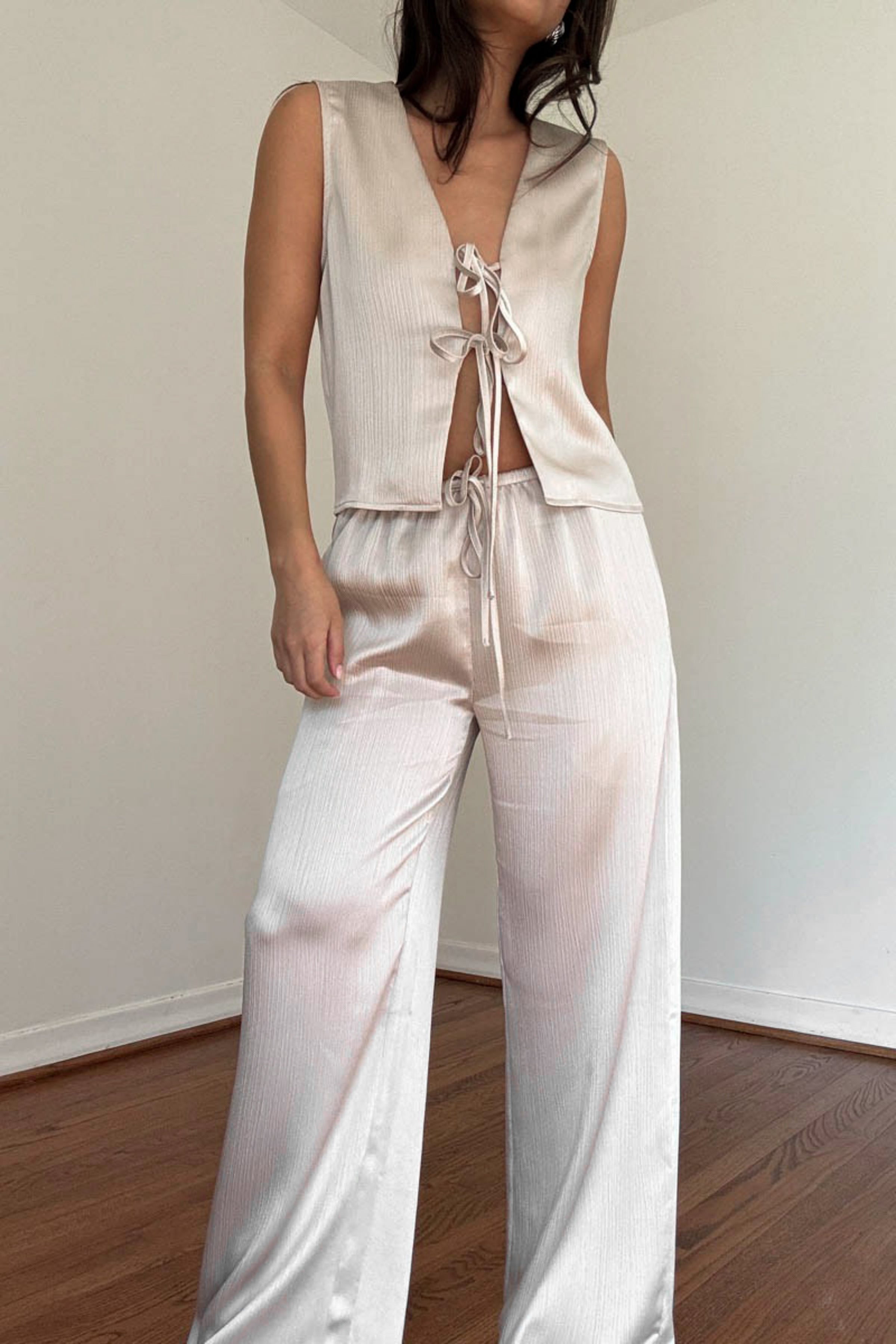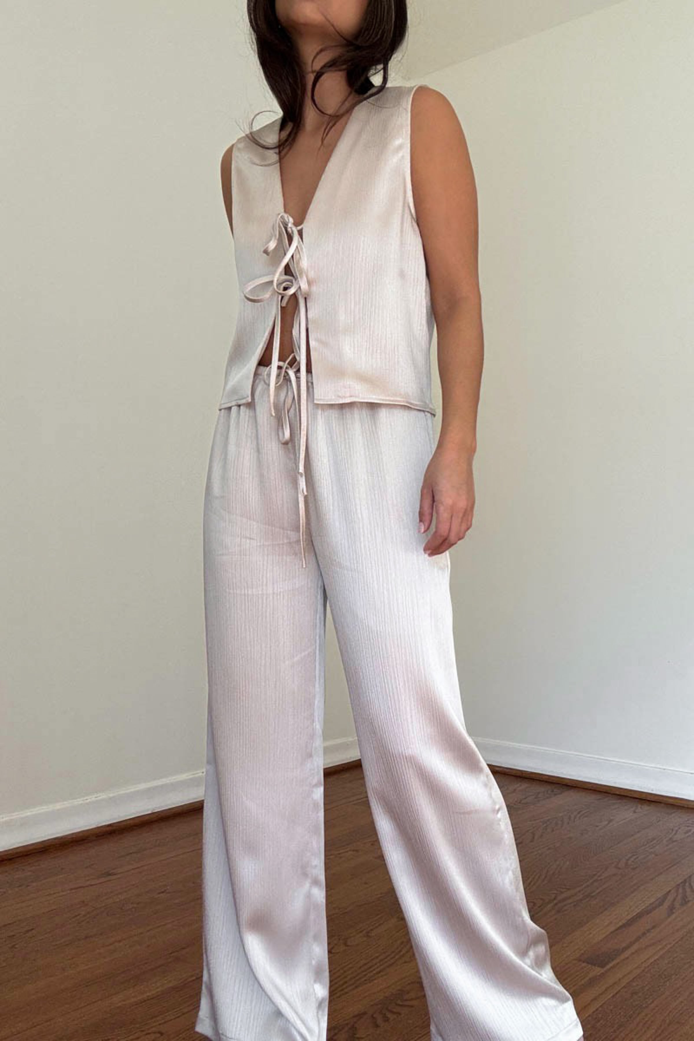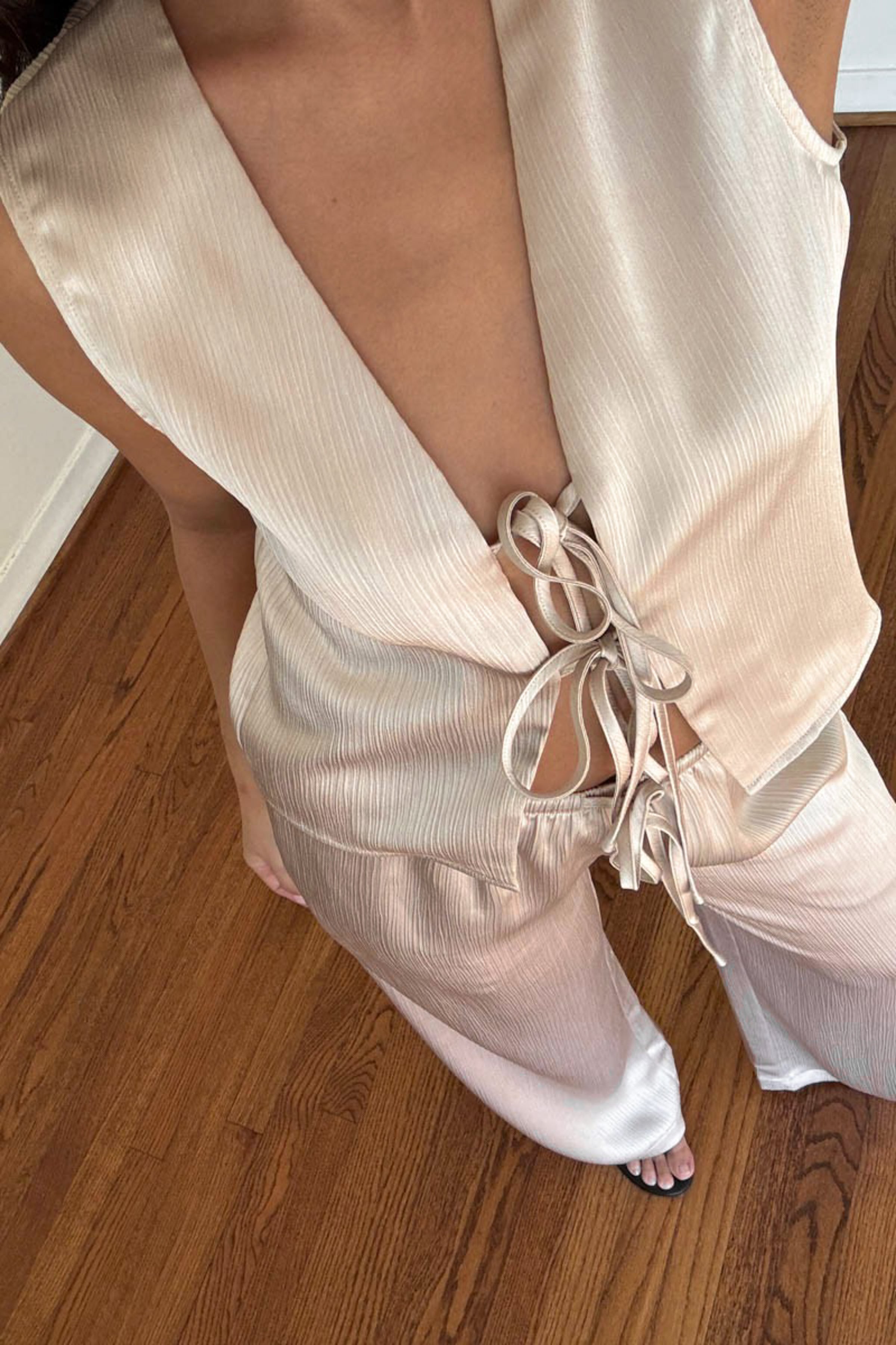 The Vera Top features a unique textured design that adds a touch of sophistication to your look. The sleeveless vest is designed with a chic front tie, allowing for a customizable fit that flatters your silhouette.